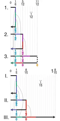 O uso de sinais alternados apenas com frações unitárias ímpares produz uma série relacionada, a fórmula de Leibniz para π: