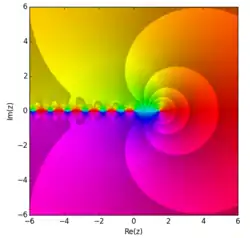 A função zeta de Riemann é definida para real pela série convergente que, para , seria a série harmônica. Ela pode ser estendida por continuação analítica para uma função holomorfa em todos os números complexos, exceto em , onde a função estendida possui um polo simples. Outros valores importantes da função zeta incluem , a solução para o problema de Basileia, a constante de Apéry , provada por Roger Apéry como sendo um número irracional, e a "linha crítica" de números complexos com parte real , conjecturada pela hipótese de Riemann como sendo os únicos valores, além dos inteiros negativos, onde a função pode ser zero.