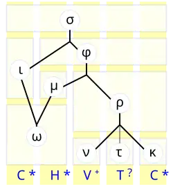 Sílabas pesadas: CVV, CCVC, CCV, CVC, CCVCC,CCVVC, CVVV – quando há ramificação do núcleo, a sílaba é bimoraica.