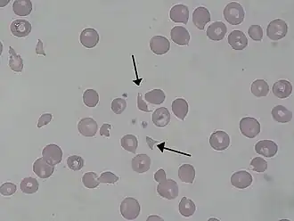 | Esquizocitos num esfregaço sanguíneo de um doente com síndrome hemolítico-urémica | |