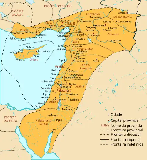 ![]() As duas províncias da Síria (e também a Eufratense) neste mapa da Diocese do Oriente c. 400 | |||||||