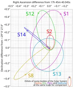 - ↑ «Orbital Parameters of Stars Orbiting Sgr A*». The Astrophysics Spectator (4.10). 11 de julho de 2007