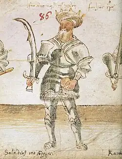 ![]() Saladino, rei do Egito (Saladin rex Ægypti), de um manuscrito do século XV. O globo em sua mão esquerda é um símbolo europeu do poder real. | |