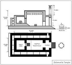 O templo media sessenta côvados de comprimento, vinte de largura e trinta de altura. Era todo revestido em seu interior por cedro, madeiras nobres, e nenhuma pedra se via; o chão era de tábuas de cipreste, também madeira nobre; posteriormente cobriu-se todo o interior do templo de ouro puro. O Santo dos Santos, câmara mais especial, que guardava a Arca da Aliança, era revestido totalmente de ouro, e era um cubo cuja aresta media vinte côvados. O altar também foi coberto de ouro. O templo também apresentava enormes átrios (pátios) exteriores.