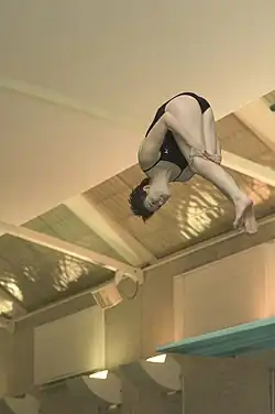 a seguir, continua a acrobacia, em mortal frontal do grupo I de saltos; e faz sua entrada na água.