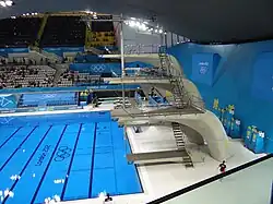 Os saltos ornamentais utilizam de uma torre de concreto, que possui trampolins de salto e em geral acaba na altura da plataforma de mergulho, a dez metros da base, localizada em áreas cobertas ou fechadas, geralmente ginásios de natação e parques aquáticos. Nela, existem três tipos de locais para saltos. A que fica no ponto mais alto é a plataforma, que deve ter 6 m de comprimento por 2,6 m de largura, e sua prancha, onde o atleta caminha para saltar, deve ser ainda coberta com material antiderrapante; já o trampolim deve ser feito de alumínio, com 50 cm de largura e 4,8 m de comprimento, e precisa estar a 1 m ou 3 m acima do nível da piscina. Logo a frente da estrutura, está a piscina, que precisa ter um mínimo de cinco metros de profundidade, para evitar acidentes. Nela, ainda é preciso ter um equipamento que mantenha a água sempre em movimento, com a formação de ondas mínimas para que os atletas possam vê-la e assim calcular melhor seus saltos.[20]