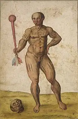 Guerreiro tupinambá com um ivirapema ao lado da cabeça de um inimigo decapitado