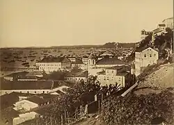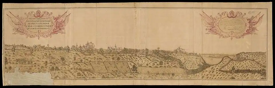 Vista de uma parte da cidade de Salvador e de seus arredores, tomada do Forte do Barbalho. Aquarela panorâmica de um artista anônimo durante o século XVIII.