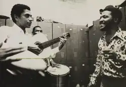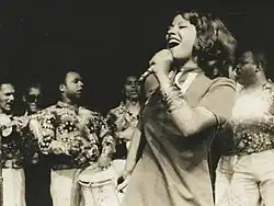 O período também ficou marcado pela grande profusão de danças performáticas em par de samba.[324] Foram os casos do samba de gafieira, estilo de dança desenvolvida nos bailes de clubes suburbanos cariocas frequentados por pessoas de baixo poder aquisitivo ao longo dos anos 1940 e 1950 e que se tornou modismo também entre pessoas de classe média alta nos anos 1960,[325][326] e o samba rock, estilo de dança nascido nos bailes da periferia paulistana na década de 1960, misturando passos vindos do samba, do rock e de ritmos caribenhos como a rumba e a salsa.[327][328][329] Nascidos em meados dos anos 1960, os “bailes blacks” e viveram seu auge notadamente no Rio e em São Paulo na década de 1970, época de grande profusão da cultura musical negra oriunda dos Estados Unidos, em torno da qual se divulgavam tais bailes. No Rio, o efervescente movimento recebeu o nome de "Black Rio", sendo a Banda Black Rio, formada por ex-membros do Abolição, o mais proeminente desses, uma vez que aprofundou as experimentações sonoras em torno de um som instrumental que mesclava o samba ao funk americano.[330] Já o contemporâneo paulistano deste movimento foi o Black São Paulo, com suas destacadas equipes de soul como a Chic Soul, Black Mad, Kaskata's e Transnegra. Também houve cenas importantes em Belo Horizonte ("Black Uai"), Porto Alegre ("Black Porto") e Bahia ("Black Bahia").[331][332][333] Em contrapartida, a produção nacional de soul music não constituía uma frente unificada, Gerson King Combo encarnava uma tendência que se alinhava mais fielmente ao padrão estadunidense.[334][335] Uma vez que mobilizavam milhares de jovens pobres e negros, isso também gerou um novo debate sobre a influência estrangeira na música brasileira e também do próprio samba.[336] Esse embate ideológico foi fomentado por personalidades de destaque no meio artístico carioca, com especial ênfase para Candeia, sambista e idealizador do Grêmio Recreativo de Artes Negras Quilombo. O artista teve uma contribuição decisiva para o fortalecimento dos costumes musicais de origem africana na capital fluminense e, no auge daquela contenda, registrou em disco o samba "Sou mais o samba", que continha um texto de forte repúdio à cena Black Rio.[337][338]