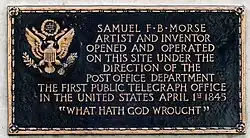 Morse fez sua última viagem a Washington, D.C., em dezembro de 1842, estendendo "fios entre duas salas de comitê no Capitólio, e enviou mensagens de um lado para o outro" para demonstrar seu sistema telegráfico.[21] O Congresso destinou $ 30 000 (equivalente a $ 981 000 em 2023) em 1843 para a construção de uma linha telegráfica experimental de 38-milha (61 km) entre Washington, D.C., e Baltimore ao longo do caminho da Baltimore and Ohio Railroad.[22] Uma demonstração impressionante ocorreu em 1 de maio de 1844, quando a notícia da nomeação do Partido Whig de Henry Clay para presidente dos Estados Unidos foi telegrafada da convenção do partido em Baltimore para o Edifício do Capitólio em Washington.[22] Em 24 de maio de 1844, a linha foi oficialmente inaugurada quando Morse enviou as palavras agora famosas, "O que Deus tem feito," da câmara da Suprema Corte no porão do edifício do Capitólio dos EUA em Washington, D.C., para a Estação Mount Clare de B&O em Baltimore.[23] Annie Ellsworth escolheu essas palavras da Bíblia (Números 23h23); seu pai, o Comissário de Patentes dos EUA Henry Leavitt Ellsworth, havia defendido a invenção de Morse e garantido financiamento inicial para ela. Seu telégrafo podia transmitir trinta caracteres por minuto.[24] Em maio de 1845, a Magnetic Telegraph Company foi formada para construir linhas telegráficas de Nova Iorque em direção a Filadélfia, Boston, Buffalo e o Mississippi.[25] As linhas telegráficas se espalharam rapidamente pelos Estados Unidos nos próximos anos, com 12 000 milhas de fio instaladas até 1850. Morse em certo momento adotou a ideia de Wheatstone e Carl August von Steinheil de transmitir um sinal telegráfico elétrico através de um corpo d'água ou ao longo de trilhos de ferro ou qualquer coisa condutora. Ele se esforçou muito para ganhar um processo judicial pelo direito de ser chamado de "inventor do telégrafo" e promoveu-se como sendo um inventor. Mas Alfred Vail também desempenhou um papel importante no desenvolvimento do Código Morse, que foi baseado em códigos anteriores para o telégrafo eletromagnético.