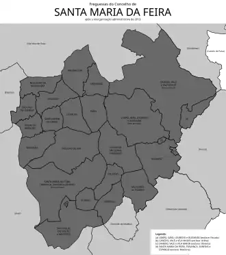 Desde a reorganização administrativa de 2012/2013,[6] o município de Santa Maria da Feira está dividido em 21 freguesias: