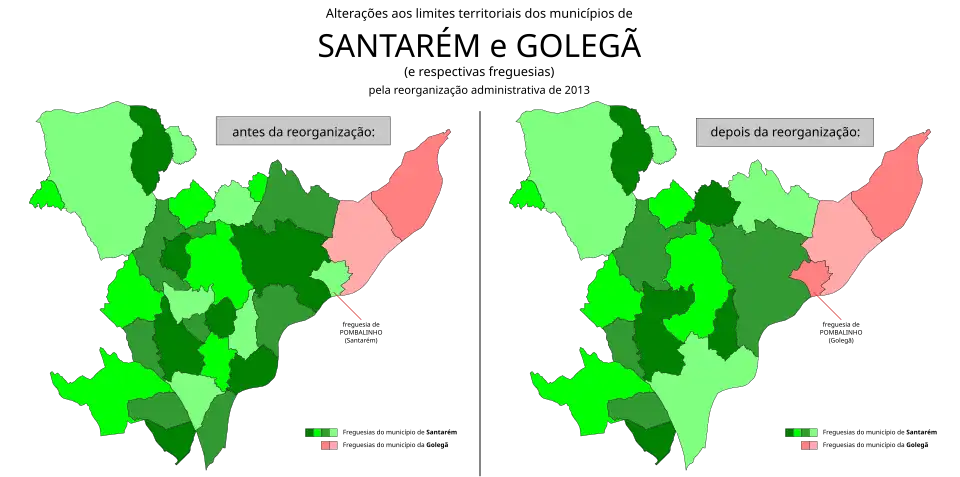 Até 2013 o município de Santarém tinha uma área de 560,24 km².[11] Nesse ano, no âmbito de uma reorganização das freguesias ocorrida no território do continente e por acordo entre os municípios de Santarém e da Golegã, foi-lhe desanexada a freguesia de Pombalinho, que foi transferida para o município da Golegã. Esta transferência, há muito pedida pela Junta de Freguesia de Pombalinho, foi objecto de acordo entre os municípios de Santarém e da Golegã, tendo posteriormente sido aprovada por Lei da Assembleia da República. À data da transferência a Freguesia de Pombalinho tinha 7,7 km² de área e 448 habitantes.[2]