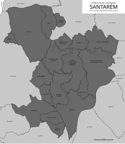 É sede do Município de Santarém[2] com 552,54 km² de área[3] e 58 671 habitantes (2021),[4][nota 1] subdividido em 18 freguesias.[2] O município é limitado a norte pelos municípios de Porto de Mós, Alcanena e Torres Novas, a leste por Abrantes e pela Chamusca, a sueste por Alpiarça e Almeirim, a sul pelo Cartaxo, a sudoeste pela Azambuja e a oeste por Rio Maior.