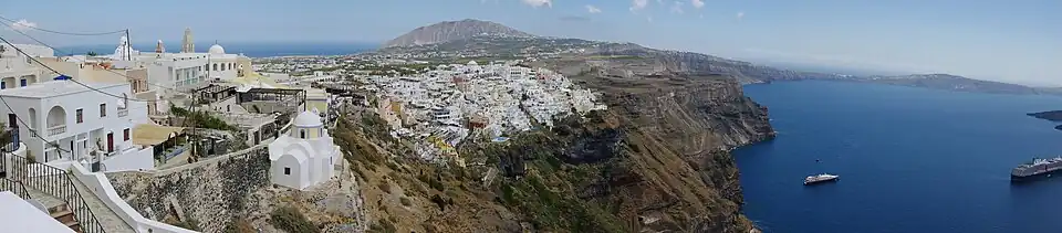 Vista panorâmica de Fira, a capital e maior localidade de Santorini