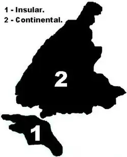 Divide-se principalmente em duas áreas geográficas distintas: a área continental e a área insular. As duas áreas diferem tanto em termos demográficos, quanto em termos econômicos e geográficos.[36]