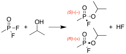 O sarin é uma molécula quiral porque tem quatro substituintes quimicamente diferentes ligados ao centro de fósforo tetraédrico.[6] A forma SP (o (–) isómero ótico) é o enantiômero mais ativo devido à sua maior ligação por afinidade a acetilcolinesterase.[7][8] É geralmente fabricado como mistura racémica - uma mistura em partes iguais de ambas as formas de enantioméricas - da reação de alcoólise do metilfosfonil difluoreto com álcool isopropílico: