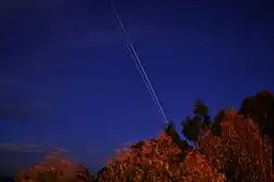 Nesta foto de alguns segundos de exposição é possível ver o traço da passagem da Estação Espacial Internacional e do ônibus espacial Atlantis