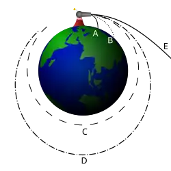Experimento mental de Newton, onde o canhão lança vários projéteis com velocidades diferentes. (em A e B, o objeto cai na superfície, em C ele descreve uma órbita circular, em D ele descreve uma órbita elíptica e em E ele escapa da influência gravitacional da Terra
