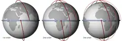 A projeção da órbita de um satélite na superfície da Terra é chamada rota no solo. Num dado instante de tempo imagina-se uma linha que liga o centro do planeta ao satélite. Quando essa linha intercepta a superfície esférica da Terra, encontra-se um ponto dessa rota, que pode ser definido a partir de uma latitude e de uma longitude. Enquanto o satélite se move, o traço formado pelo conjunto desses pontos forma uma rota no solo. Os satélites da órbita terrestre baixa (como a Estação Espacial Internacional), por exemplo, atingem uma latitude máxima e mínima enquanto orbitam o planeta, e por isso a curva formada por um desses satélites lembra uma curva senoidal quando feita sobre um mapa com a projeção de Mercator.[22]