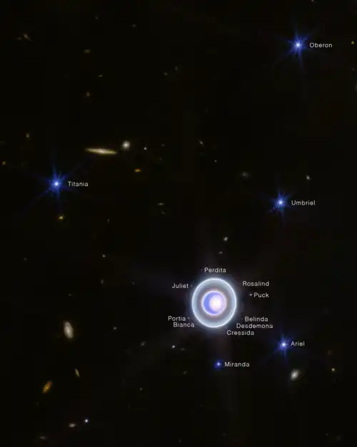 - ↑ Paul, Richard (2014). «The Shakespearean Moons of Uranus». folger.edu. Folger Shakespeare Library. Consultado em 1 de março de 2024