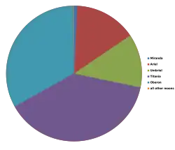 Todos os satélites principais de Urano contêm quantidades aproximadamente iguais de rocha e gelo, com exceção de Miranda, que é feito primariamente de gelo.[30] Os componentes de gelo podem incluir amônia e dióxido de carbono.[31] A superfície dos satélites possui muitas crateras, apesar de todos os satélites (com exceção de Umbriel) mostrarem sinais de renovação endógena da superfície na forma de cânions, e no caso de Miranda, estruturas ovoides chamadas coronae.[3] É provável que processos de extensão associados com diapiros ascendentes são os responsáveis pela origem das coronae.[32] A superfície de Ariel aparenta ser a mais jovem e a com menos crateras, enquanto a de Umbriel parece ser a mais velha.[3] O aquecimento que causou a atividade endógena em Miranda e Ariel pode ter sido causado por uma ressonância orbital 3:1 no passado entre Miranda e Umbriel e uma 4:1 entre Ariel e Titânia.[33][34] Uma evidência para essas ressonâncias no passado é a inclinação orbital anormal de Miranda (4,34°) para um corpo tão perto do planeta.[35][36] As grandes luas de Urano podem ser internamente diferenciadas, com núcleos rochosos em seu centro cercados por mantos de gelo.[30] Titânia e Oberon podem abrigar oceanos de água líquida na divisa entre o núcleo e o manto.[30] As luas principais de Urano são corpos com pouca atmosfera. Por exemplo, Titânia não possui nenhum atmosfera em pressões maiores que 10–20 nanobar.[37]