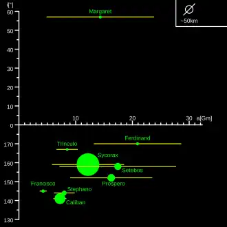 | 27 | XIX | Setebos | ![]() | ~48 | 0,075 | 17 418 000 | −2225,21 | 145,883° | 0,5914 | 1999 | Kavelaars et al. |