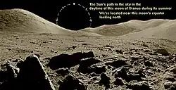 O caminho do Sol em Urano e suas luas durante o solstício é bem diferente do caminho do Sol em outros corpos do Sistema Solar. As luas principais têm quase exatamente a mesma inclinação axial que Urano (seus eixos são paralelos aos de Urano).[3] O Sol segue um caminho circular em volta do polo celestial de Urano, a no mínimo 7 graus longe dele.[nota 3]