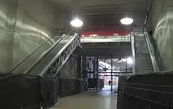 Escadas rolantes para um novo sistema PATH de conexão com o complexo de escritórios em construção CIBC Square sendo instalado no saguão da arena em 2019
