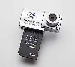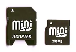 O formulário miniSD foi introduzido em março de 2003 na CeBIT pela SanDisk Corporation, que o anunciou e demonstrou.[9] A SDA adotou o cartão microSD em 2003 como uma extensão de formato pequeno para o padrão de cartão SD. Embora os novos cartões tenham sido projetados especialmente para telefones celulares, eles geralmente são embalados com um adaptador miniSD que oferece compatibilidade com um slot de cartão de memória SD padrão.