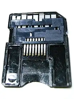 | Dimensões | Padrão: 32,0 × 24,0 × 2,1 mm (1,260 × 0,945 × 0,083 pol.) 1.612,8 mm3 (0,09842 pol.3) Mini: 21,5 × 20,0 × 1,4 mm (0,846 × 0,787 × 0,055 pol) 602 mm3 (0,0367 pol3) Micro: 15,0×11,0×1,0 mm (0,591×0,433×0,039 pol) 165 mm3 (0,0101 pol3) |
