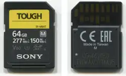 | Mecanismo de leitura | Padrão : 12,5 MB/s Alta velocidade : 25 MB/s UHS-I : 50 MB/s ou 104 MB/s UHS-II : 156 MB/s full-duplex ou 312 MB/s half-duplex UHS-III : 312 MB/s full-duplex ou 624 MB/s half-duplex Expresso : ≥ 985 MB/s full-duplex |