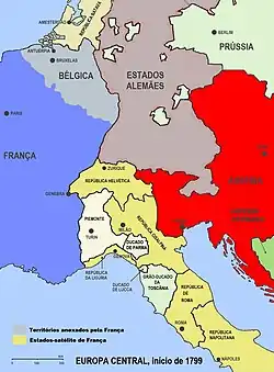 Em abril de 1798, os franceses ocuparam a Suíça, onde a Revolução Francesa teve uma forte repercussão. Uma série de revoltas registaram-se em diversos cantões da Suíça. Durante esse conflito interno, o político suíço Frederico César de La Harpe propôs a intervenção de tropas francesas com a finalidade de impor os princípios revolucionários em todos os cantões. No início do ano de 1798, as tropas francesas entraram no cantão de Vaud, que tinha proclamado a independência e, a partir daí, foi feita a ocupação de toda a Suíça. Estes acontecimentos conduziram à proclamação da República Helvética a 12 de abril de 1798, organizada segundo o modelo francês. No dia 19 de agosto de 1798, a República Helvética e a República Francesa assinaram um tratado de defesa mútua. A França, entretanto, tinha anexado os cantões de Genebra, Neuchâtel, Berna e o território do bispo de Basileia, atual Jura.[12]