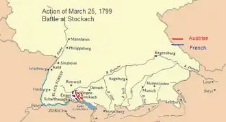 Em março de 1799, o Exército de Mayance, um dos exércitos franceses da Revolução, com cerca de 40 000 homens e sob comando do general Jean-Baptiste Jourdan, iniciou a ofensiva francesa na Alemanha, atravessou o rio Reno em Kehl e Hüningen e avançou pela Floresta Negra. O primeiro confronto com as forças austríacas, cerca de 80 000 homens sob o comando do arquiduque Carlos da Áustria-Teschen, deu-se no dia 21 de março em Ostrach, uma aldeia no sul da Alemanha, o que resultou numa derrota para os franceses. Este resultado não impediu Jourdan de ordenar imediatamente um ataque contra a ala direita austríaca. A Batalha de Stockach, travada a 25 de março, foi uma vitória dos franceses, que, no entanto, não impediu o contra-ataque austríaco. Este foi lançado contra o centro do dispositivo de Jourdan. As baixas foram mais elevadas do lado austríaco (6 000) do que do lado francês (3 600), mas a ofensiva francesa perdeu o ímpeto e parou. Perante forças superiores, Jourdan retirou ao anoitecer do dia 26, em ordem, para a região do Reno.[35][36][37]