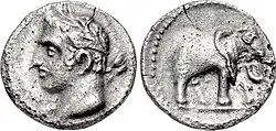 Quarto-xéquel cartaginês de 237–209 a.C., mostrando o deus Melcarte. No reverso está um elefante, possivelmente um elefante de guerra, que era conectado aos Barca.[65]