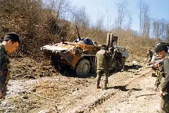 ![]() BTR-80 russo parcialmente destruído após uma emboscada em Zhani-Vedeno. | |||