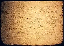 Tradução: “Que nenhum estrangeiro entre dentro do parapeito e da divisória que circunda o recinto do Templo. Quem for pego [violando] será responsabilizado por sua morte subsequente.”