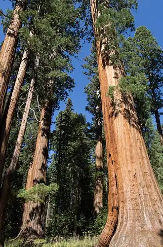 Alguns espécimes de sequoia-gigante são as árvores mais massivas do mundo.[6] Estas árvores crescem até uma altura média de 50-85 m, com diâmetros de tronco à altura do peito que variam de 6-8 m. Foram medidas algumas árvores especialmente altas, tendo uma delas atingido os 94,8 m de altura. Têm sido apontados diâmetros do tronco de até 17 m, mas os dados parecem ter sido obtidos a partir de citações pouco credíveis por estarem fora do contexto.[10] O espécime conhecido por ter o maior diâmetro à altura do peito é a árvore conhecida por General Grant, com 8,8 m, mas medidas recordes de sequoias como 115 metros de altura e 18 metros de diâmetro já foram reportadas.[11][12] Entre 2014 e 2016 foi noticiado que teriam sido localizados espécimes de Sequoia sempervirens com diâmetros de tronco maiores do que todas as sequoias gigantes conhecidas, mas essa informação não foi verificada de forma independente ou afirmado em qualquer literatura académica.[13] Os troncos das sequoias-costeiras afilam-se em alturas mais baixas do que os das sequoias-gigantes, que têm troncos colunares que mantêm grandes diâmetros até maior altura.