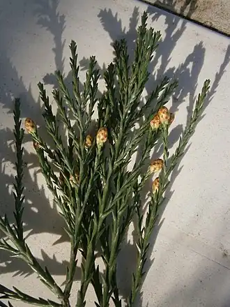 Folhas com cones masculinos fechados.