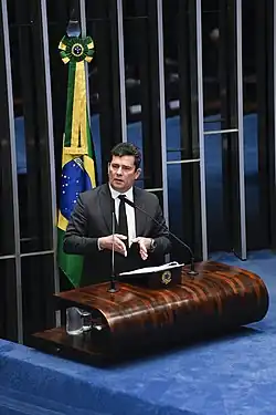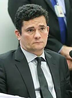 Sergio Fernando Moro[nota 3] GCRB • GOMM • DMJM[1] (Maringá, 1 de agosto de 1972) é um jurista, ex-magistrado, professor universitário e político brasileiro filiado ao Partido Liberal (PL).[2][3] É senador da República pelo estado do Paraná desde 2023. Foi juiz federal, professor da Universidade Federal do Paraná (UFPR)[4] e ministro da Justiça e Segurança Pública do governo Jair Bolsonaro.[5]