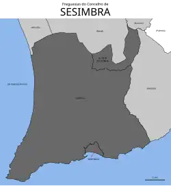 O município de Sesimbra,[3] com 195,47 km² de área[4] e 52 394 habitantes (censo de 2021)[5][2][6] está subdividido em 3 freguesias.[3] Esse município é limitado a norte pelos municípios de Almada e de Seixal, a nordeste por Barreiro, a leste por Setúbal e a sul e a oeste tem litoral no oceano Atlântico.