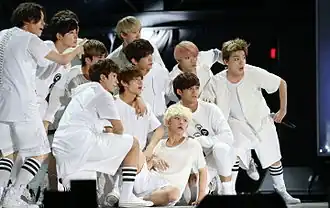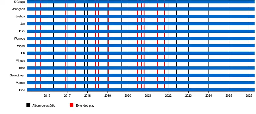 ![]() Seventeen em junho de 2022 (E–D: Woozi, Seungkwan, Mingyu, Jeonghan, Vernon, Hoshi, The8, Dino, Joshua, DK, Jun, Wonwoo e S.Coups) | |