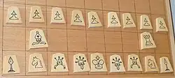 - ↑ «Sono Hoka no Goshitsumon: Koma no Narabikata ni Kimari wa Aru no Deshōka?» その他のご質問: 駒の並べ方に決まりはあるのでしょうか? [Other questions: Is there a certain way to set up the pieces?] (em japonês). 日本将棋連盟 (Japan Shogi Association). Consultado em 17 de dezembro de 2014.