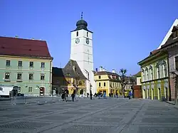 Junto à Igreja Jesuíta ergue-se a Torre do Conselho (em romeno: (Turnul Sfatului; em alemão: Ratturm ou Ratsturm), um dos símbolos da cidade. É provável que esta antiga torre de fortificação tenha sido construída como parte da segunda cerca de muralhas, que deve ter ocorrido entre 1224 e 1241. É mencionada pela primeira vez num documento de 1370. Originalmente estava integrada numa das portas da segunda linha de muralhas e tinha somente quatro andares, mas foi remodelada várias vezes ao longo dos séculos. Atualmente tem sete andares, sucessivamente ligeiramente mais estreitos à medida que se sobe. Na parte sul da torre há baixos-relevos com dois leões, que se supõe terem feito parte da torre original do século XIII. A torre teve vários usos: foi sucessivamente um armazém de cereais, torre de vigilância de fogos, cadeia e, em meados dos século XVIII, museu de ciências naturais. Entre 1962 e 1998 albergou o departamento medieval do Museu Brukenthal. A entrada para a torre é feita por uma pequena porta que dá acesso a uma escada em espiral. Do penúltimo andar pode observar-se o relógio e do último andar, transformado numa sala panorâmica tem-se uma vista aérea do centro histórico.