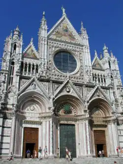 A sua catedral, iniciada em meados do século XII, é um representativo exemplo da arquitectura gótica italiana. A fachada principal, obra de Giovani Pisano, foi terminada em 1380; no interior pode ver-se o púlpito octogonal apoiado sobre leões de Nicola Pisano, e o seu pavimento de mosaicos. Sob a catedral, no baptistério, encontra-se a magnífica pia baptismal com baixo-relevos de Donatello, Ghiberti, Jacopo della Quercia e outros escultores do século XV. A Pinacoteca Nacional de Siena tem importante coleção de obras do Trecento e do Quattrocento.