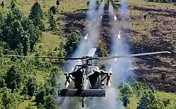 - MH-60K Black Hawk: Modificação de operações especiais ordenada pela primeira vez em 1988 para uso pelo 160º Regimento de Aviação de Operações Especiais do Exército dos EUA ("Night Stalkers").[150] Equipado com a sonda de reabastecimento em voo,[152] e motores T700-GE-701C. Mais avançado que o MH-60L, o modelo K também inclui um sistema aviônico integrado (glass cockpit), radar de acompanhamento de terreno AN/APQ-174B, mapa meteorológico colorido, capacidade de armas aprimorada e vários sistemas defensivos.[152][153]