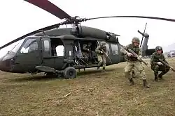Exemplo de uma evacuação médica do U/HH-60 Black Hawk - UH-60Q Black Hawk: UH-60A modificado para evacuação médica.[141][142] O UH-60Q é nomeado DUSTOFF por "serviço dedicado e sem hesitação às nossas forças de combate".[143]