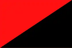 A bandeira diagonal vermelha e preta foi utilizada pela primeira vez pela Confederação Nacional do Trabalho, na Espanha, em uma mobilização de primeiro de maio em 1931, logo após a proclamação da Segunda República Espanhola. Bandeiras vermelhas e pretas já eram usadas por anarquistas por décadas, mas divididas verticalmente ou horizontalmente.[13] O design diagonal foi sugerido por Juan García Oliver. De acordo com o historiador e anarquista Abel Paz, a CNT estava dividida simbolicamente quanto à escolha "sob qual bandeira marchar". Na divisão, haviam anarquistas de "bandeira vermelha", mais ligados a questões econômicas e trabalhistas, e de "bandeira negra", mais ligados a questões culturais. De acordo com Paz:
