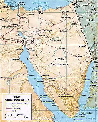 O Sinai é uma península montanhosa e desértica do Egito, situada na Ásia, entre os golfos de Suez e Ácaba. O nome tem origem no deus Sin, deus da lua. Por isso se diz que Sinai é a "Terra da Lua"; e a terra das águas turquesa da Paz. Ocupa uma posição estratégica que une dois continentes - África e Ásia - separando também dois mares - o Mediterrâneo e o Mar Vermelho. A Península tem uma superfície de 61 000 km² em forma triangular dividindo-se em duas partes: Sinai do Norte e do Sul. A sua fauna é muito variada e extremamente rica especialmente em aves. Também a flora é de grande valor, possuindo mais de 5 mil classes de plantas diferentes.