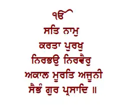 Texto do Mul Mantar, a oração principal do siquismo, em alfabeto gurmukhi.