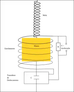Sismógrafos atuais que utilizam acelerômetro como sensor são chamados de FBA, do inglês Force Balanced Accelerometer (Acelerômetro Balanceado por Força, em tradução literal), utilizando o principio do balanço de forças.[1] Este sensor utiliza um transdutor de deslocamento, que é um capacitor de placas paralelas fixas com uma placa móvel entre elas.[2] Esta placa se desloca com a massa, e para posições fora do equilíbrio o transdutor gera uma corrente através do enrolamento através de um resistor R em um ciclo de realimentação negativa de modo que a polaridade da corrente gere uma força que seja igual e oposta a inércia da massa, tentando impedir o movimento relativo da massa. Esta corrente é linearmente proporcional a aceleração do solo, por isso a aceleração do solo é então medida pela voltagem sobre o resistor.[1]